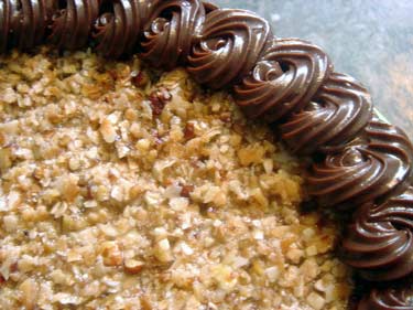 Although Germany is famous for tall, multi-layered torten with alternating layers of cream, cake, fruit, nuts, beer, sausages, etc…German Chocolate Cake is decidedly the result of good-old American ingenuity. Deep, dark chocolate cake is layered with a rich filling of toasty coconut and pecans, then glazed with a slick, bittersweet chocolate icing