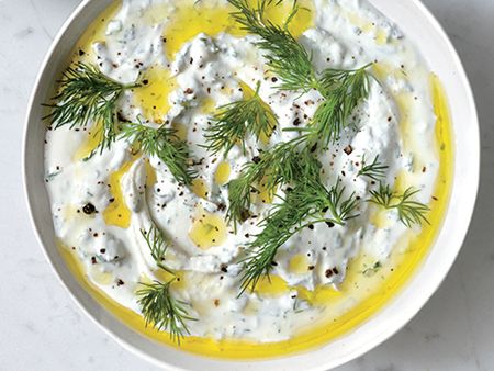 These spinach-packed and dill-spiced latkes are begging for a tangy feta dipping sauce.